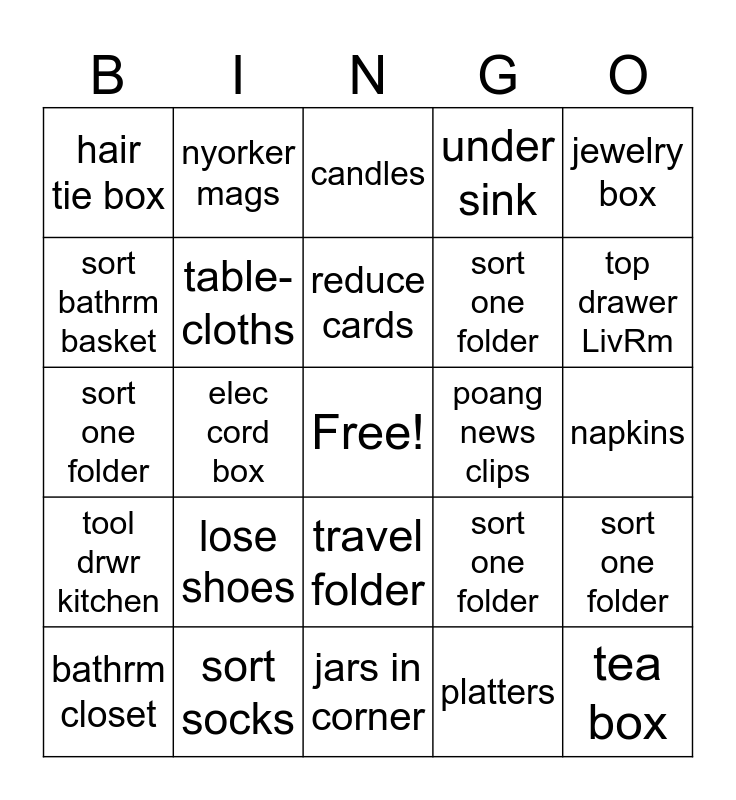 This bingo card has a free space and 24 words: lose shoes, sort socks, reduce cards, bathrm closet, jewelry box, hair tie box, sort bathrm basket, nyorker mags, poang news clips, travel folder, sort one folder, sort one folder, sort one folder, sort one folder, table-cloths, platters, napkins, candles, top drawer LivRm, elec cord box, tea box, tool drwr kitchen, under sink and jars in corner.