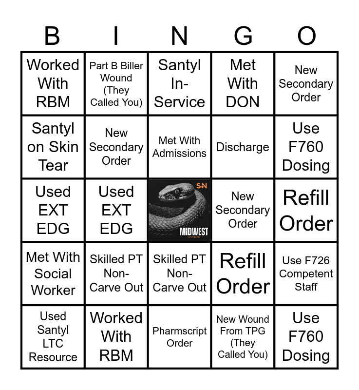 This bingo card has a free space and 48 words: New Secondary Order, Use F760 Dosing, Used Santyl LTC Resource, Pharmscript Order, Skilled PT Non-Carve Out, Met With Social Worker, Part B Biller Wound (They Called You), Use F686 Pressure, Santyl on Skin Tear, Hospice Order, New Secondary Order, Met With DON, Use F726 Competent Staff, Refill Order, PharMerica Order, Copay Gets Paid, Met With Admissions, New Secondary Order, Santyl In-Service, New Secondary Order, Used EXT EDG, New Wound From TPG (They Called You), Worked With RBM, Discharge, Discharge, Use F760 Dosing, Used Santyl LTC Resource, Pharmscript Order, Skilled PT Non-Carve Out, Met With Social Worker, Part B Biller Wound (They Called You), Use F686 Pressure, New Secondary Order, Hospice Order, Worked With RBM, Met With DON, Use F726 Competent Staff, Refill Order, PharMerica Order, Copay Gets Paid, Met With Admissions, New Secondary Order, Santyl In-Service, New Secondary Order, Used EXT EDG, New Wound From TPG (They Called You), Carve Out and New Secondary Order.