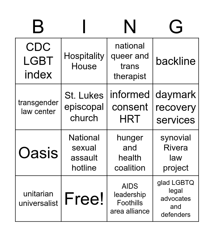 This bingo card has 16 words: Free!, synovial Rivera law project, national queer and trans therapist, CDC LGBT index, Oasis, Hospitality House, hunger and health coalition, AIDS leadership Foothills area alliance, transgender law center, St. Lukes episcopal church, unitarian universalist, backline, National sexual assault hotline, daymark recovery services, informed consent HRT and glad LGBTQ legal advocates and defenders.