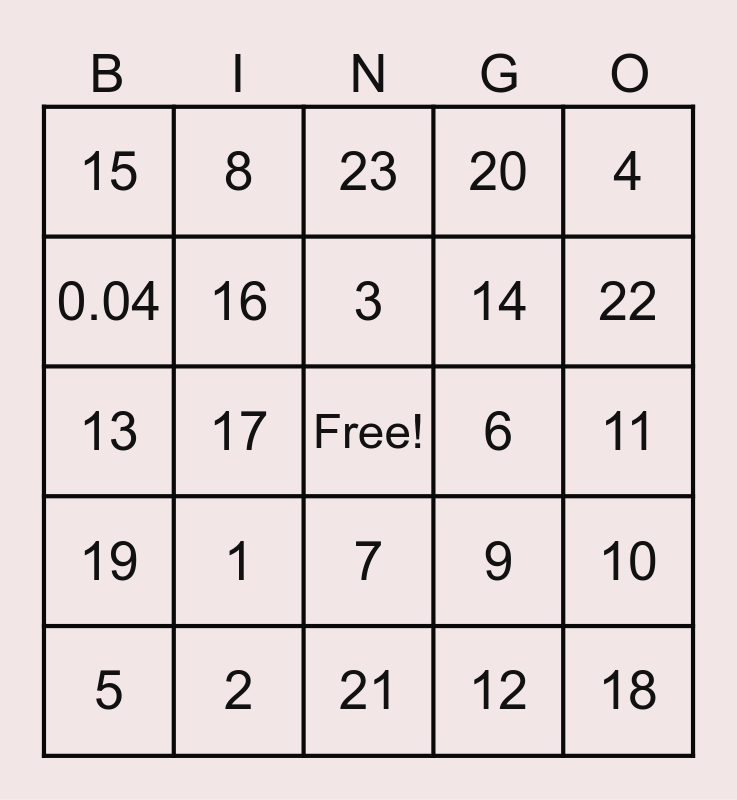 This bingo card has a free space and 24 words: 1, 2, 3, 5, 4, 15, 0.04, 8, 6, 7, 14, 13, 9, 10, 16, 12, 11, 23, 22, 17, 18, 19, 20 and 21.