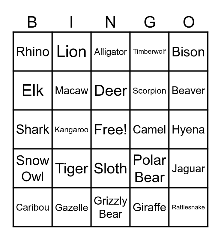 This bingo card has a free space and 24 words: Tiger, Gazelle, Deer, Caribou, Bison, Rhino, Elk, Lion, Camel, Sloth, Scorpion, Shark, Polar Bear, Jaguar, Macaw, Giraffe, Hyena, Alligator, Beaver, Kangaroo, Rattlesnake, Snow Owl, Timberwolf and Grizzly Bear.