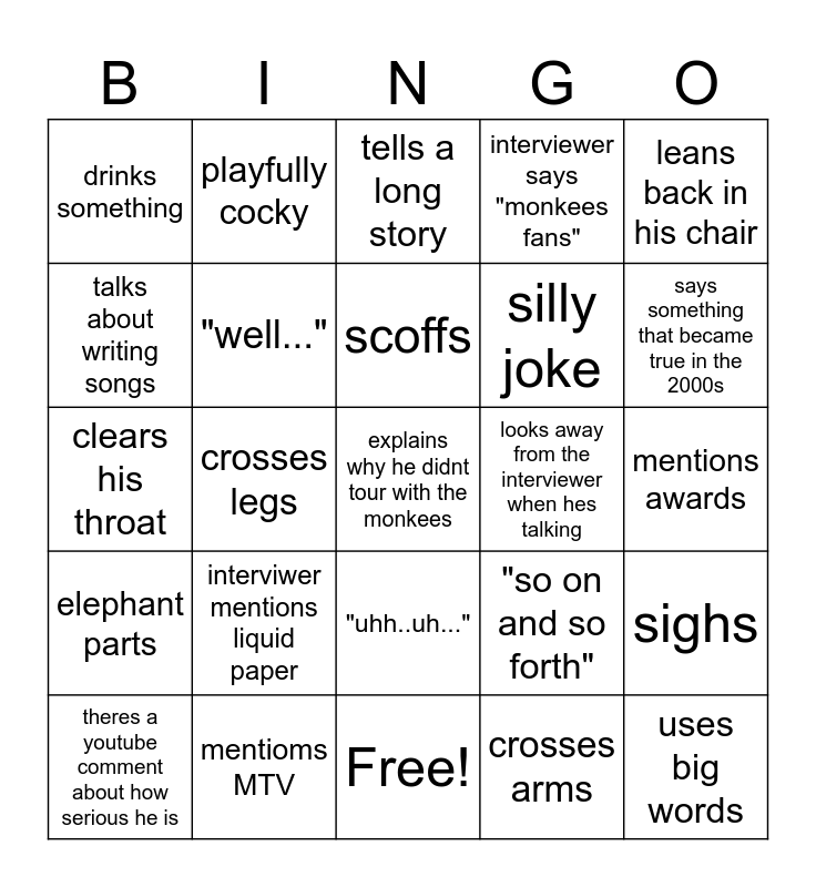 This bingo card has 25 words: elephant parts, mentioms MTV, explains why he didnt tour with the monkees, crosses arms, leans back in his chair, drinks something, playfully cocky, tells a long story, looks away from the interviewer when hes talking, sighs, talks about writing songs, "well...", Free!, "so on and so forth", says something that became true in the 2000s, theres a youtube comment about how serious he is, crosses legs, scoffs, silly joke, mentions awards, clears his throat, interviwer mentions liquid paper, "uhh..uh...", interviewer says "monkees fans" and uses big words.