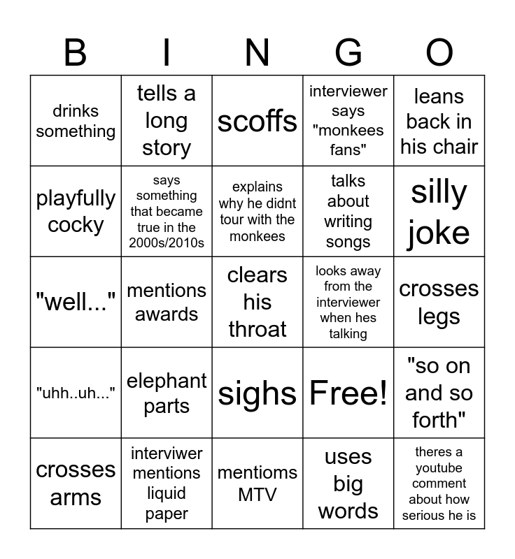 This bingo card has 25 words: elephant parts, mentioms MTV, explains why he didnt tour with the monkees, crosses arms, leans back in his chair, drinks something, playfully cocky, tells a long story, looks away from the interviewer when hes talking, sighs, talks about writing songs, "well...", Free!, "so on and so forth", says something that became true in the 2000s/2010s, theres a youtube comment about how serious he is, crosses legs, scoffs, silly joke, mentions awards, clears his throat, interviwer mentions liquid paper, "uhh..uh...", interviewer says "monkees fans" and uses big words.