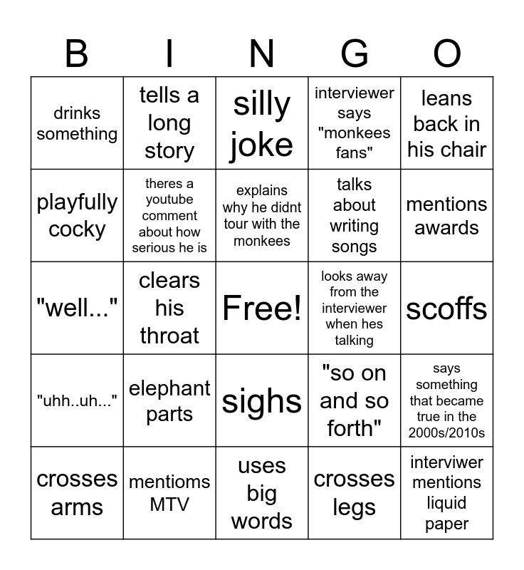 This bingo card has a free space and 24 words: elephant parts, mentioms MTV, explains why he didnt tour with the monkees, crosses arms, leans back in his chair, drinks something, playfully cocky, tells a long story, looks away from the interviewer when hes talking, sighs, talks about writing songs, "well...", "so on and so forth", says something that became true in the 2000s/2010s, theres a youtube comment about how serious he is, crosses legs, scoffs, silly joke, mentions awards, clears his throat, interviwer mentions liquid paper, "uhh..uh...", interviewer says "monkees fans" and uses big words.