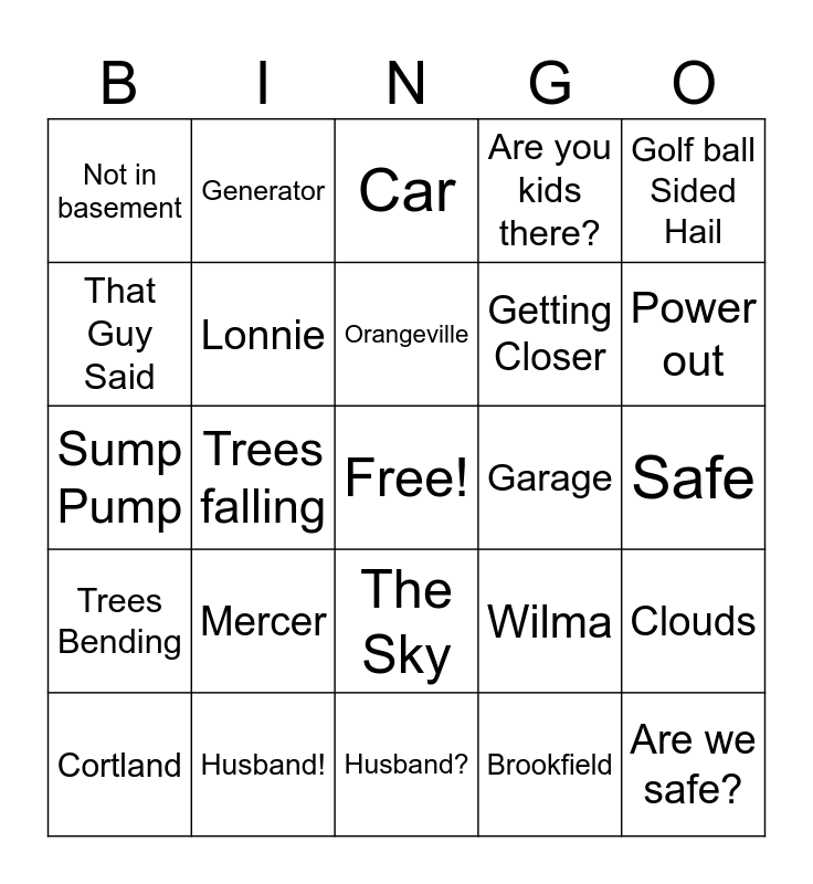 This bingo card has a free space and 24 words: Cortland, Mercer, Orangeville, Brookfield, Golf ball Sided Hail, Not in basement, Generator, Car, Garage, Safe, Sump Pump, Lonnie, Wilma, Clouds, That Guy Said, Husband!, Husband?, Are you kids there?, Power out, Trees Bending, Trees falling, The Sky, Getting Closer and Are we safe?.