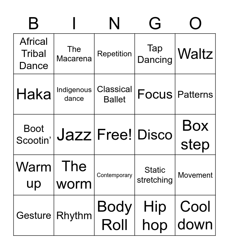 This bingo card has a free space and 35 words: Bollywood, Irish Reel, Breakdancing, Indigenous dance, Contemporary, Tap Dancing, Haka, Latin Ballroom, Classical Ballet, Cheerleading, Boot Scootin’, Waltz, Belly dancing, Hula, Africal Tribal Dance, Disco, Hip hop, Jazz, Warm up, Cool down, Static stretching, Gesture, Movement, Rhythm, Repetition, Patterns, Freestyle, 8-count, Focus, Box step, Great Vine, Body Roll, The worm, The Macarena and The Nutbush.