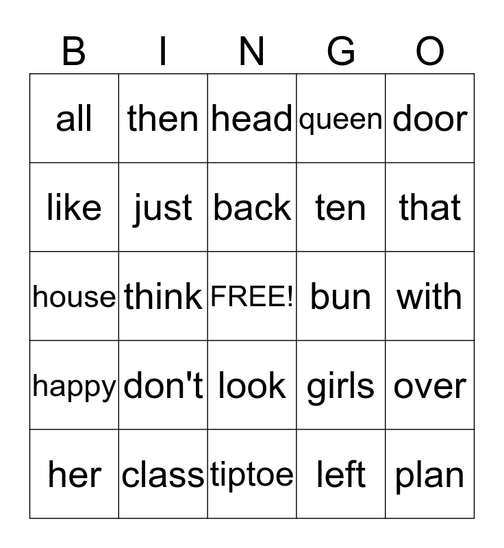 This bingo card has a free space and 24 words: don't, class, back, her, door, all, like, then, bun, look, ten, house, girls, over, just, left, with, head, that, think, plan, happy, queen and tiptoe.