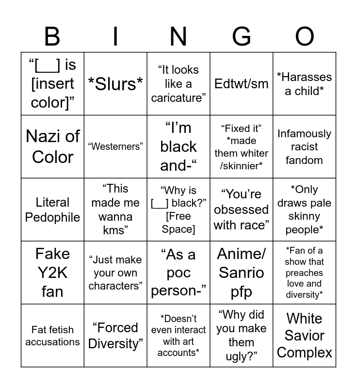 This bingo card has a free space and 24 words: Fat fetish accusations, “Just make your own characters”, “I’m black and-“, “Why did you make them ugly?”, *Harasses a child*, “[__] is [insert color]”, *Slurs*, “It looks like a caricature”, “You’re obsessed with race”, *Only draws pale skinny people*, Literal Pedophile, “Westerners”, Anime/ Sanrio pfp, *Fan of a show that preaches love and diversity*, Nazi of Color, “Forced Diversity”, *Doesn’t even interact with art accounts*, Edtwt/sm, Infamously racist fandom, Fake Y2K fan, “This made me wanna kms”, “As a poc person-”, “Fixed it” *made them whiter /skinnier* and White Savior Complex.