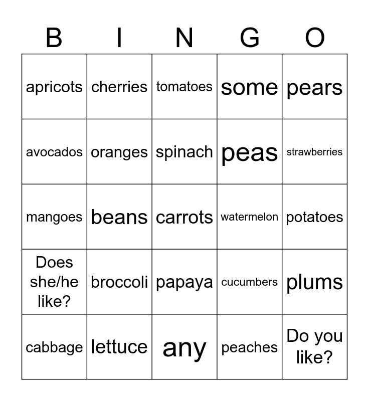 This bingo card has a free space and 24 words: broccoli, lettuce, spinach, cabbage, pears, apricots, avocados, cherries, watermelon, papaya, peas, mangoes, cucumbers, plums, oranges, peaches, potatoes, tomatoes, strawberries, beans, Do you like?, Does she/he like?, some and any.