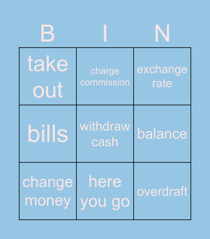 This bingo card has 9 words: change money, exchange rate, charge commission, bills, take out, balance, withdraw cash, overdraft and here you go.
