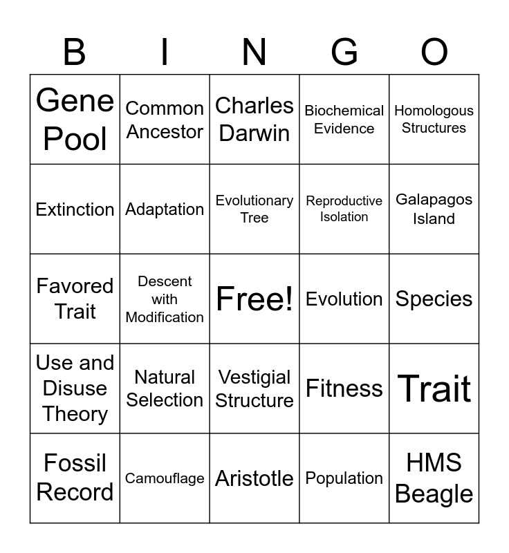 This bingo card has a free space and 24 words: Natural Selection, Camouflage, Evolutionary Tree, Fossil Record, Homologous Structures, Gene Pool, Extinction, Common Ancestor, Evolution, Vestigial Structure, Reproductive Isolation, Favored Trait, Fitness, Trait, Adaptation, Population, Species, Charles Darwin, Galapagos Island, Descent with Modification, HMS Beagle, Use and Disuse Theory, Biochemical Evidence and Aristotle.