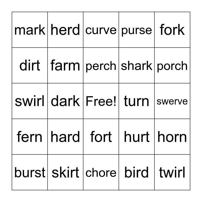This bingo card has a free space and 24 words: hard, skirt, perch, burst, fork, mark, dirt, herd, turn, fort, shark, swirl, hurt, horn, farm, bird, swerve, curve, porch, dark, twirl, fern, purse and chore.