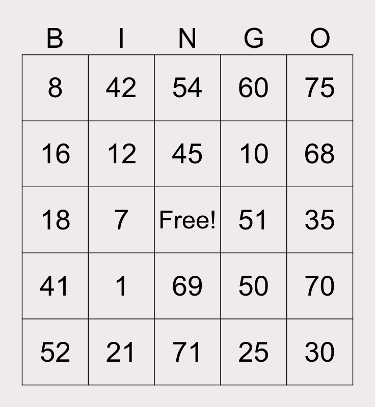 This bingo card has a free space and 24 words: 1, 21, 45, 52, 75, 8, 16, 42, 51, 69, 10, 18, 50, 70, 12, 25, 35, 54, 68, 7, 30, 41, 60 and 71.