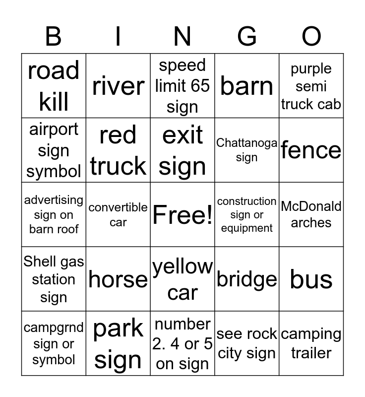 This bingo card has a free space and 24 words: horse, park sign, exit sign, campgrnd sign or symbol, purple semi truck cab, road kill, airport sign symbol, river, construction sign or equipment, yellow car, Chattanoga sign, advertising sign on barn roof, bridge, bus, red truck, see rock city sign, McDonald arches, speed limit 65 sign, fence, convertible car, camping trailer, Shell gas station sign, barn and number 2. 4 or 5 on sign.