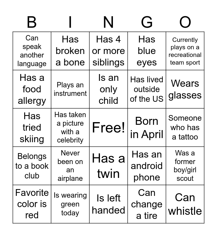 This bingo card has a free space and 29 words: Favorite color is red, Has curly hair, Has taken a picture with a celebrity, Is the oldest child, Can speak another language, Has 4 or more siblings, Plays an instrument, Never been on an airplane, Born in April, Is wearing green today, Someone who has a tattoo, Can whistle, Is left handed, Can change a tire, Wears glasses, First name starts with C, Has a twin, Belongs to a book club, Currently plays on a recreational team sport, Has tried skiing, Has an android phone, Is a vegetarian, Has lived outside of the US, Has a food allergy, Has blue eyes, Has broken a bone, Was a former boy/girl scout, Is an only child and Is not on Facebook.