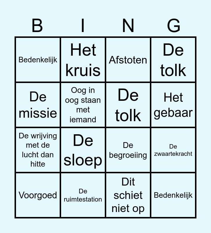 ⚠ This card has duplicate items: De wrijving met de lucht dan hitte (2), Bedenkelijk (2), De tolk (2), Met stomheid geslagen (2)