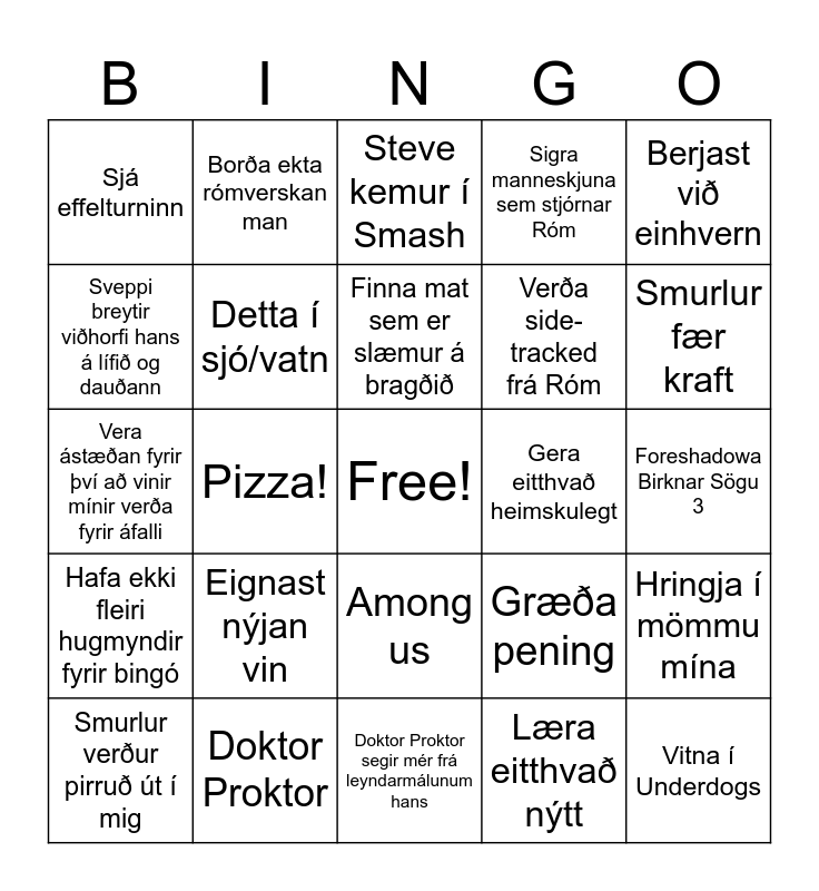 This bingo card has a free space and 24 words: Eignast nýjan vin, Doktor Proktor, Finna mat sem er slæmur á bragðið, Smurlur verður pirruð út í mig, Berjast við einhvern, Sjá effelturninn, Sveppi breytir viðhorfi hans á lífið og dauðann, Borða ekta rómverskan man, Gera eitthvað heimskulegt, Among us, Verða side-tracked frá Róm, Vera ástæðan fyrir því að vinir mínir verða fyrir áfalli, Græða pening, Hringja í mömmu mína, Detta í sjó/vatn, Læra eitthvað nýtt, Foreshadowa Birknar Sögu 3, Steve kemur í Smash, Smurlur fær kraft, Pizza!, Vitna í Underdogs, Hafa ekki fleiri hugmyndir fyrir bingó, Sigra manneskjuna sem stjórnar Róm and Doktor Proktor segir mér frá leyndarmálunum hans.