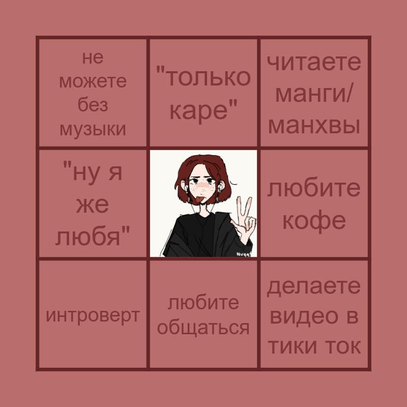This bingo card has a free space and 8 words: любите кофе, читаете манги/манхвы, "только каре", интроверт, не можете без музыки, делаете видео в тики ток, "ну я же любя" and любите общаться.