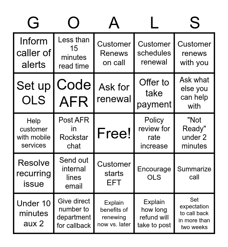 This bingo card has a free space and 25 words: Send out internal lines email, Explain benefits of renewing now vs. later, Ask for renewal, Under 10 minutes aux 2, Customer renews with you, Inform caller of alerts, Set up OLS, Less than 15 minutes read time, Policy review for rate increase, Customer starts EFT, Offer to take payment, Help customer with mobile services, Encourage OLS, Summarize call, Code AFR, Offer alternatives versus calling back, "Not Ready" under 2 minutes, Customer Renews on call, Ask what else you can help with, Post AFR in Rockstar chat, Set expectation to call back in more than two weeks, Give direct number to department for callback, Resolve recurring issue, Customer schedules renewal and Explain how long refund will take to post.