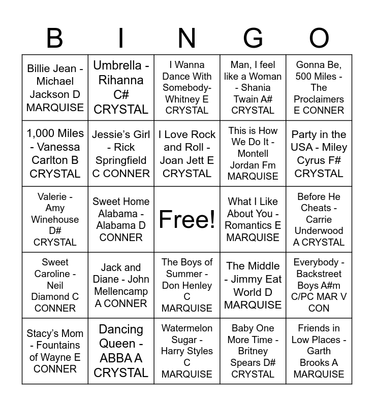 This bingo card has a free space and 40 words: Shut Up and Dance - Walk the Moon A V1 MAR V2 CON, Valerie - Amy Winehouse D# CRYSTAL, You Make My Dreams - Hall and Oates F MARQUISE, Jessie’s Girl - Rick Springfield C CONNER, Dancing Queen - ABBA A CRYSTAL, The Boys of Summer - Don Henley C MARQUISE, I Love Rock and Roll - Joan Jett E CRYSTAL, Summer of 69 - Brian Adams C MARQUISE, Gonna Be, 500 Miles - The Proclaimers E CONNER, Sweet Caroline - Neil Diamond C CONNER, Sweet Home Alabama - Alabama D CONNER, Man, I feel like a Woman - Shania Twain A# CRYSTAL, Friends in Low Places - Garth Brooks A MARQUISE, Before He Cheats - Carrie Underwood A CRYSTAL, What I Like About You - Romantics E MARQUISE, Jack and Diane - John Mellencamp A CONNER, Living on a Prayer - Bon Jovi C MARQUISE, Billie Jean - Michael Jackson D MARQUISE, Uptown Funk - Bruno Mars D ALL, I Wanna Dance With Somebody-Whitney E CRYSTAL, Everybody - Backstreet Boys A#m C/PC MAR V CON, Baby One More Time - Britney Spears D# CRYSTAL, This is How We Do It - Montell Jordan Fm MARQUISE, 1,000 Miles - Vanessa Carlton B CRYSTAL, All Star - Smash Mouth G CONNER, Love Story - Taylor Swift D CRYSTAL, Hey Ya! - Outkast G V1/B MAR V2 CON, Rolling in the Deep - Adele D CRYSTAL, Mr. Brightside - The Killers C CONNER, All The Small Things - Blink 182 C MARQUISE, Since you Been Gone - Kelly Clarkson F CRYSTAL, Stacy’s Mom - Fountains of Wayne E CONNER, Sk8ter Boi - Avril Lavigne D CRYSTAL, The Middle - Jimmy Eat World D MARQUISE, Party in the USA - Miley Cyrus F# CRYSTAL, Watermelon Sugar - Harry Styles C MARQUISE, Teenage Dream - Katy Perry E CRYSTAL, Closer - Chainsmokers A JOSH + CRYSTAL, Umbrella - Rihanna C# CRYSTAL and Blinding Lights - Weeknd C MARQUISE.