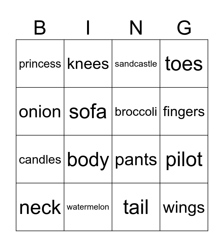 This bingo card has 16 words: watermelon, pilot, sandcastle, princess, candles, knees, pants, tail, onion, sofa, neck, toes, body, fingers, broccoli and wings.
