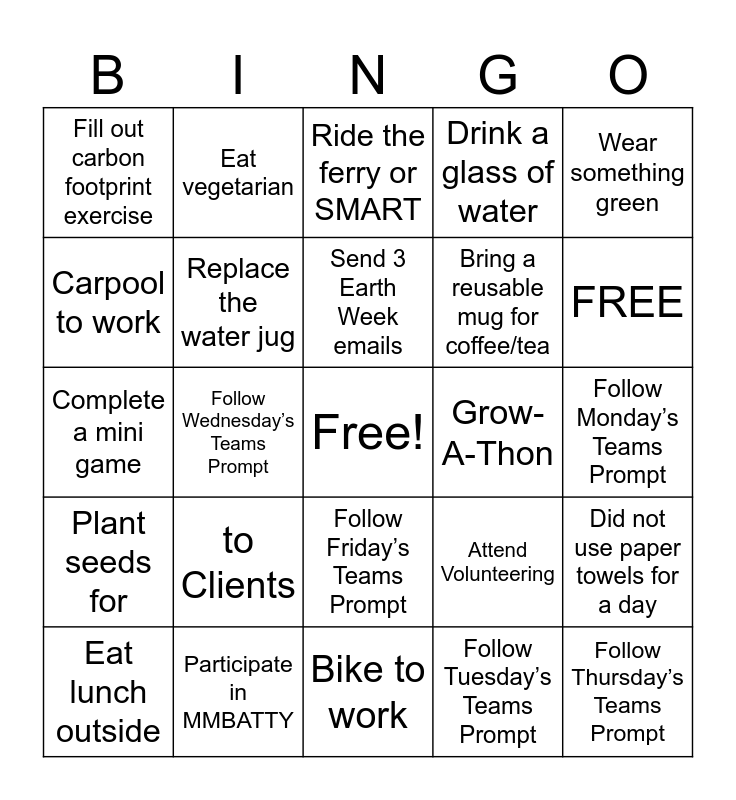 This bingo card has a free space and 27 words: Attend Volunteering, Go for a walk, Bring a reusable mug for coffee/tea, Bike to work, Carpool to work, Ride the ferry or SMART, Eat vegetarian, Plant seeds for, Grow-A-Thon, Did not use paper towels for a day, Complete a mini game, Drink a glass of water, Eat lunch outside, Participate in MMBATTY, FREE, Wear something thrifted, Replace the water jug, Send 3 Earth Week emails, to Clients, Fill out carbon footprint exercise, Follow Monday’s Teams Prompt, Follow Tuesday’s Teams Prompt, Follow Wednesday’s Teams Prompt, Follow Thursday’s Teams Prompt, Follow Friday’s Teams Prompt, Wear something green and Bring something for Show & Tell.