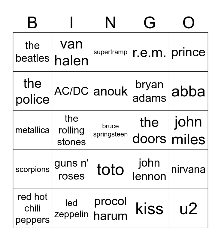 This bingo card has 30 words: led zeppelin, queen, the rolling stones, meat loaf, the beatles, supertramp, AC/DC, toto, the doors, procol harum, john miles, bruce springsteen, kiss, u2, abba, the animals, john lennon, scorpions, guns n' roses, prince, metallica, simon & garfunkel, van halen, bryan adams, the police, r.e.m., nirvana, red hot chili peppers, anouk and creedence clearwater revival.