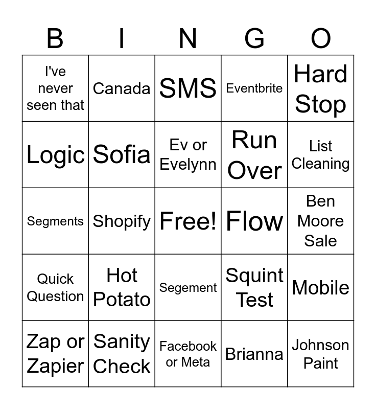 This bingo card has a free space and 24 words: Hot Potato, Sanity Check, Ev or Evelynn, Zap or Zapier, Hard Stop, I've never seen that, Logic, Canada, Flow, Segement, Run Over, Segments, Squint Test, Mobile, Sofia, Brianna, Ben Moore Sale, SMS, List Cleaning, Shopify, Johnson Paint, Quick Question, Eventbrite and Facebook or Meta.