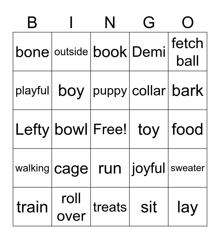 This bingo card has a free space and 24 words: cage, roll over, puppy, train, fetch ball, bone, playful, outside, toy, run, collar, Lefty, joyful, sweater, boy, sit, food, book, bark, bowl, lay, walking, Demi and treats.