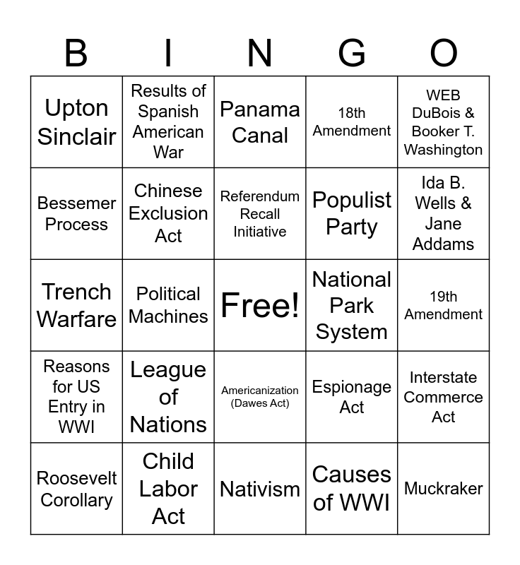 This bingo card has a free space and 25 words: League of Nations, Nativism, Referendum Recall Initiative, Roosevelt Corollary, WEB DuBois & Booker T. Washington, Upton Sinclair, Bessemer Process, Results of Spanish American War, National Park System, Americanization (Dawes Act), Populist Party, Trench Warfare, Espionage Act, Interstate Commerce Act, Chinese Exclusion Act, Imperialism, 19th Amendment, Panama Canal, Ida B. Wells & Jane Addams, Political Machines, Muckraker, Child Labor Act, Reasons for US Entry in WWI, 18th Amendment and Causes of WWI.