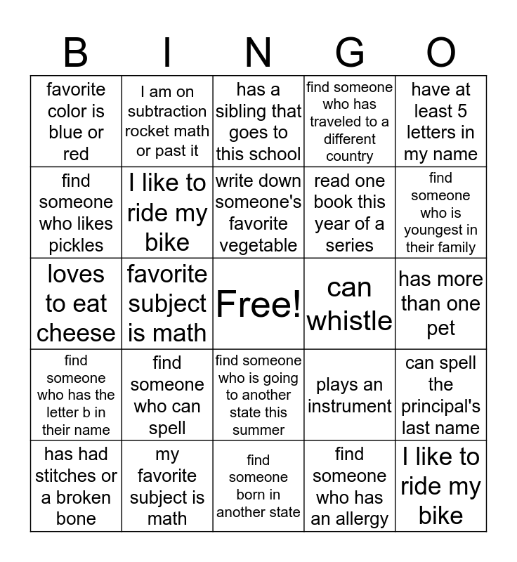 This bingo card has a free space and 24 words: find someone who can spell, my favorite subject is math, write down someone's favorite vegetable, has had stitches or a broken bone, have at least 5 letters in my name, favorite color is blue or red, find someone who likes pickles, I am on subtraction rocket math or past it, can whistle, find someone who is going to another state this summer, read one book this year of a series, loves to eat cheese, plays an instrument, can spell the principal's last name, I like to ride my bike, find someone who has an allergy, has more than one pet, has a sibling that goes to this school, find someone who is youngest in their family, favorite subject is math, I like to ride my bike, find someone who has the letter b in their name, find someone who has traveled to a different country and find someone born in another state.