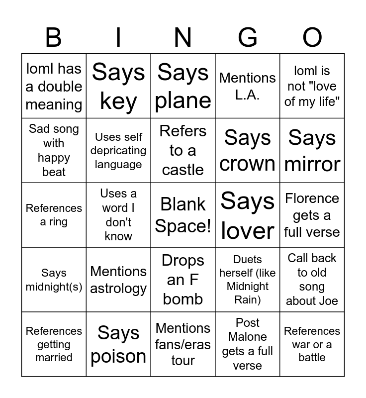 This bingo card has a free space and 39 words: Heartbeat in the background, Typewriter sounds, Says 2AM or 3AM, Uses self depricating language, References getting married, Drops an F bomb, Refers to a castle, Says midnight(s) Names a color Says wine, loml is not "love of my life", Says midnight(s), Uses a word I don't know, Mentions L.A., References war or a battle, Florence gets a full verse, Says lover, Mentions astrology, Says bar, loml has a double meaning, Mentions type of flower or says flower(s), Duets herself (like Midnight Rain), Sad song with happy beat, Mentions fans/eras tour, Says crown, Says mirror, Names a color, References alcohol or getting drunk, Says silent/silence, Says hallway, Says blood, Says key, Says cat(s), Football reference or pun, Says plane, Says poison, Post Malone gets a full verse, Chaotic surprise on release night, Call back to old song about Joe, References a ring and Greyscale colors.