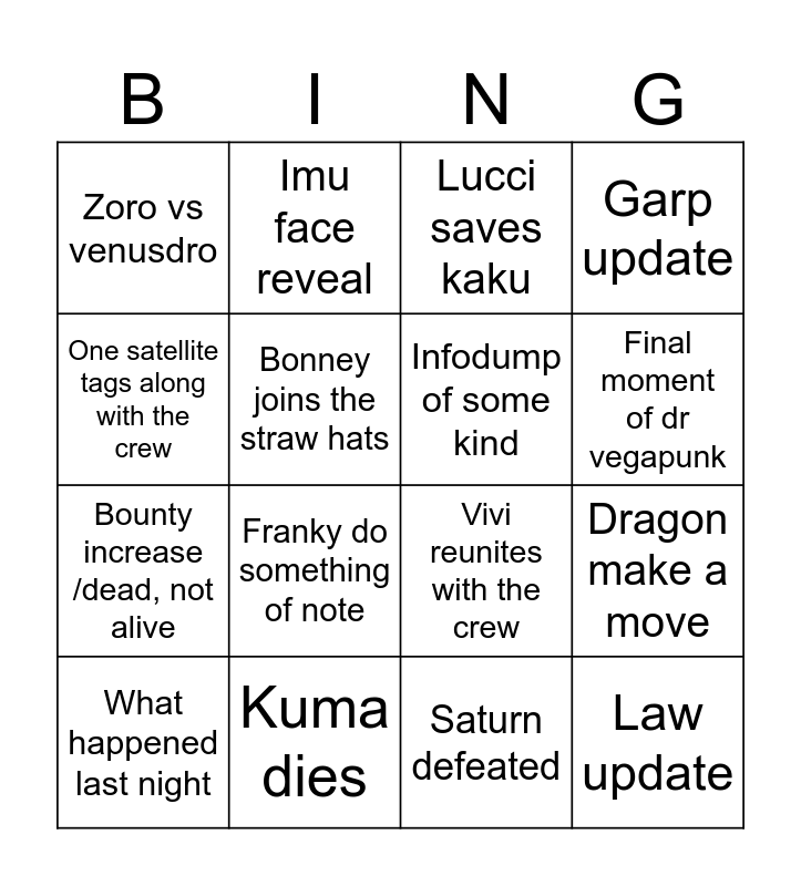 This bingo card has 16 words: Kuma dies, Dragon make a move, Lucci saves kaku, Zoro vs venusdro, Bounty increase /dead, not alive, Imu face reveal, Vivi reunites with the crew, Saturn defeated, One satellite tags along with the crew, Bonney joins the straw hats, What happened last night, Garp update, Franky do something of note, Final moment of dr vegapunk, Infodump of some kind and Law update.