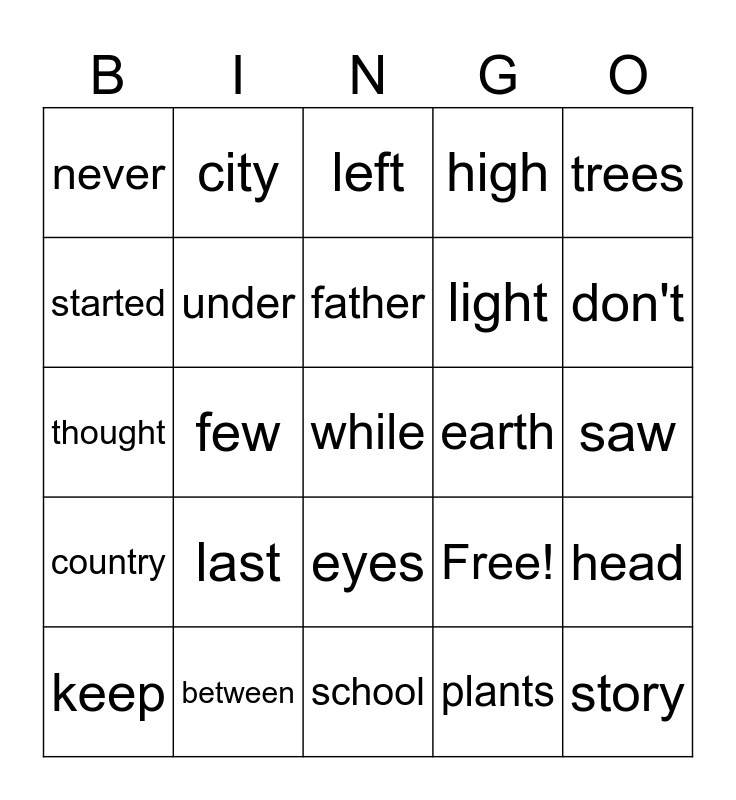 This bingo card has 25 words: last, school, father, keep, trees, never, started, city, earth, eyes, light, thought, Free!, head, under, story, saw, left, don't, few, while, between, country, high and plants.