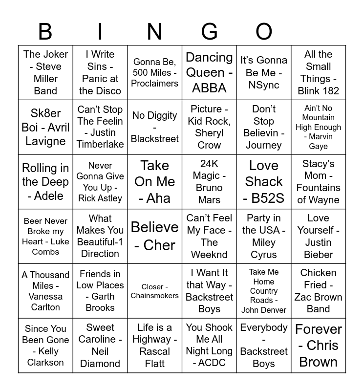 This bingo card has 40 words: Life is a Highway - Rascal Flatt, Don’t Stop Believin - Journey, Jessie’s Girl - Rick Springfield, Sk8er Boi - Avril Lavigne, Can’t Feel My Face - The Weeknd, Stacy’s Mom - Fountains of Wayne, Can’t Stop The Feelin - Justin Timberlake, What’s Up - 4 Non Blondes, It’s Gonna Be Me - NSync, 24K Magic - Bruno Mars, Ain’t No Mountain High Enough - Marvin Gaye, Dancing Queen - ABBA, Rolling in the Deep - Adele, Take On Me - Aha, Never Gonna Give You Up - Rick Astley, Love Shack - B52S, Chicken Fried - Zac Brown Band, The Joker - Steve Miller Band, You Shook Me All Night Long - ACDC, Gonna Be, 500 Miles - Proclaimers, What Makes You Beautiful-1 Direction, Love Yourself - Justin Bieber, No Diggity - Blackstreet, All the Small Things - Blink 182, Everybody - Backstreet Boys, I Want It that Way - Backstreet Boys, Friends in Low Places - Garth Brooks, Forever - Chris Brown, A Thousand Miles - Vanessa Carlton, Closer - Chainsmokers, Fast Car - Tracy Chapman, Believe - Cher, Since You Been Gone - Kelly Clarkson, Beer Never Broke my Heart - Luke Combs, Picture - Kid Rock, Sheryl Crow, Party in the USA - Miley Cyrus, Take Me Home Country Roads - John Denver, Sweet Caroline - Neil Diamond, I Write Sins - Panic at the Disco and September - Earth, Wind, and Fire.
