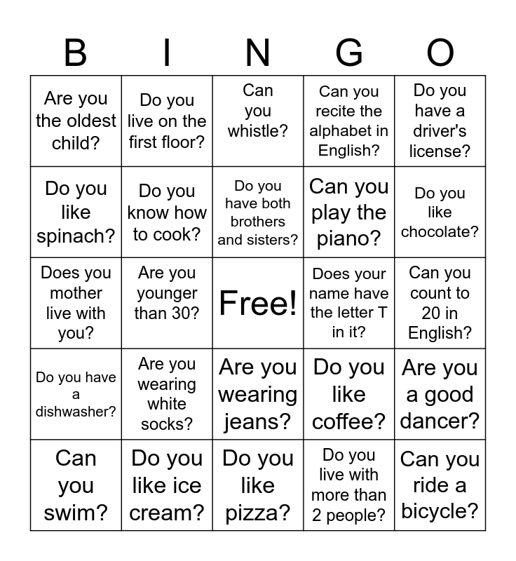 This bingo card has a free space and 24 words: Are you wearing white socks?, Do you like ice cream?, Do you have both brothers and sisters?, Can you swim?, Do you have a driver's license?, Are you the oldest child?, Do you like spinach?, Do you live on the first floor?, Does your name have the letter T in it?, Are you wearing jeans?, Can you play the piano?, Does you mother live with you?, Do you like coffee?, Are you a good dancer?, Do you know how to cook?, Do you live with more than 2 people?, Can you count to 20 in English?, Can you whistle?, Do you like chocolate?, Are you younger than 30?, Can you ride a bicycle?, Do you have a dishwasher?, Can you recite the alphabet in English? and Do you like pizza?.