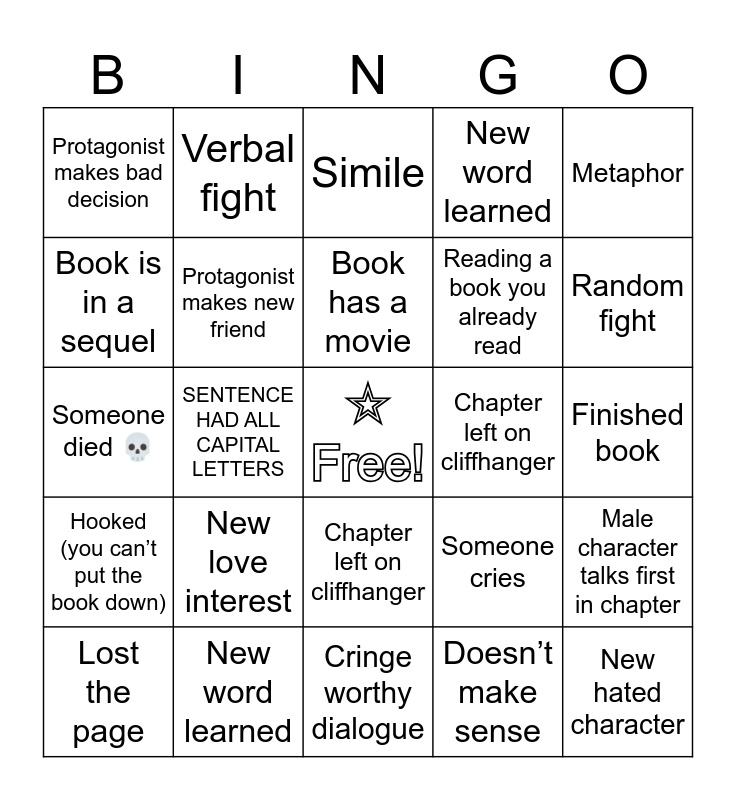 This bingo card has a free space and 45 words: Book bingo, New hated character, Part that made you visibly laugh/smile, Lost the page, Lost the page, Doesn’t make sense, Simile, Simile, Metaphor, New word learned, New word learned, Chapter left on cliffhanger, Chapter left on cliffhanger, New love interest, Cringe worthy dialogue, Cringe worthy dialogue, New favorite character, Someone died 💀, Flashback, Random fight, Verbal fight, Fight related to plot, Protagonist makes bad decision, Protagonist makes bad decision, Part that made you audibly gasp, Finished book, Part that made you angry, Part that made you sad, Someone cries, Hooked (you can’t put the book down), Female character talks first in chapter, Male character talks first in chapter, Protagonist actually does something smart, Protagonist actually does something smart, SENTENCE HAS ALL CAPITAL LETTERS, SENTENCE HAD ALL CAPITAL LETTERS, Italic Words, Sentence is in a different language, Book is by foreign author, Book has a movie, Book is in a sequel, Reading a book you already read, Gruesome scene, Protagonist makes new friend and Protagonist makes new enemy.