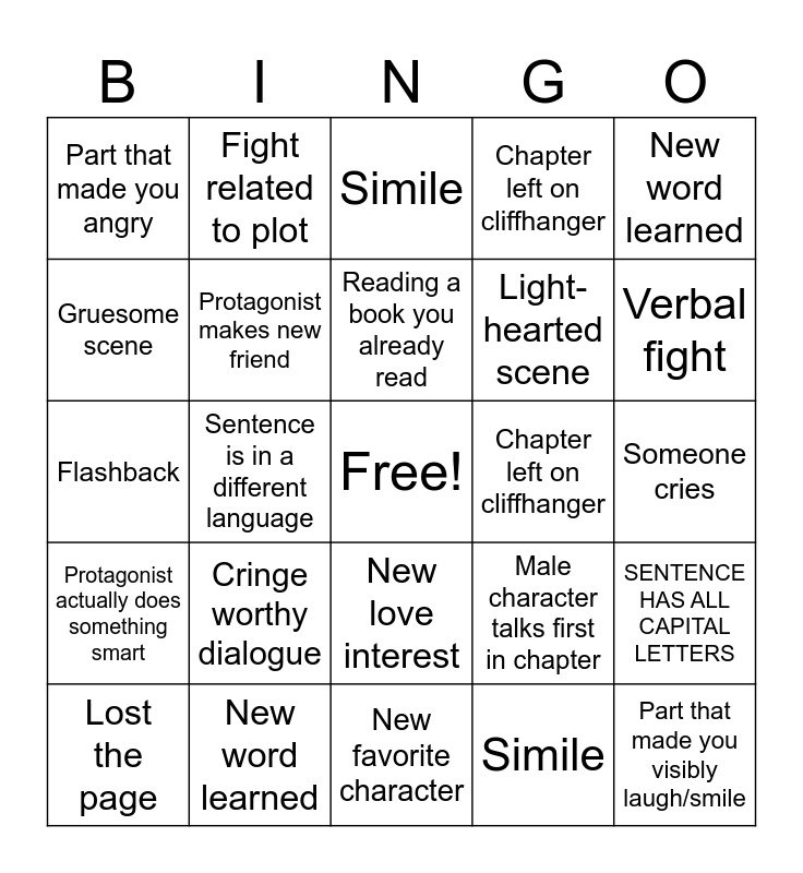 This bingo card has a free space and 44 words: New hated character, Part that made you visibly laugh/smile, Lost the page, Lost the page, Doesn’t make sense, Simile, Simile, Metaphor, New word learned, New word learned, Chapter left on cliffhanger, Chapter left on cliffhanger, New love interest, Cringe worthy dialogue, Cringe worthy dialogue, New favorite character, Someone died 💀, Flashback, Random fight, Verbal fight, Fight related to plot, Protagonist makes bad decision, Finished book, Part that made you angry, Part that made you sad, Someone cries, Hooked (you can’t put the book down), Female character talks first in chapter, Male character talks first in chapter, Protagonist actually does something smart, Protagonist actually does something smart, SENTENCE HAS ALL CAPITAL LETTERS, SENTENCE HAD ALL CAPITAL LETTERS, Italic Words, Sentence is in a different language, Book is by foreign author, Book has a movie, Book is in a sequel, Reading a book you already read, Gruesome scene, Light-hearted scene, Sad scene, Protagonist makes new friend and Protagonist makes new enemy.