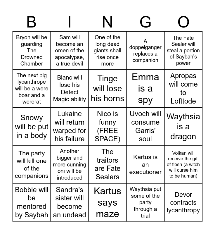 This bingo card has a free space and 24 words: Another bigger and more cunning oni will be introduced, Sandra's sister will become an undead, Tinge will lose his horns, Bobbie will be mentored by Saybah, The Fate Sealer will steal a portion of Saybah's power, Bryon will be guarding The Drowned Chamber, The next big lycanthrope will be a were boar and a wererat, Sam will become an omen of the apocalypse, a true devil, Uvoch will consume Garris' soul, The traitors are Fate Sealers, Emma is a spy, Snowy will be put in a body, Kartus is an executioner, Volkan will receive the gift of flesh (a witch will curse him to be human), Blanc will lose his Detect Magic ability, Waythsia put some of the party through a trial, Waythsia is a dragon, One of the long dead giants shall rise once more, Apropas will come to Lofttode, Lukaine will return warped for his failure, Devor contracts lycanthropy, The party will kill one of the companions, A doppelganger replaces a companion and Kartus says maze.