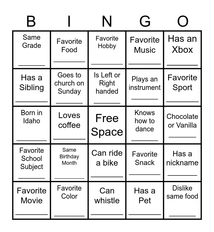 This bingo card has a free space and 28 words: Has a nickname _______, Favorite Game ________, Plays an instrument _______, Has a Pet _______, Has a Sibling _______, Favorite Hobby _________, Favorite Food ________, Favorite School Subject _______, Knows how to dance _______, Favorite Movie _______, Born in Idaho ________, Favorite Music _______, Favorite Color ________, Can whistle _______, Favorite Sport _______, Was NOT born in Idaho ________, Same Birthday Month __________, Goes to church on Sunday _______, Is Left or Right handed _______, Can ride a bike _______, Same Grade _______, Favorite Candy _______, Dislike same food _______, Loves coffee _______, Chocolate or Vanilla _______, Favorite Snack ________, Has an Xbox ______ and Favorite Drink ________.