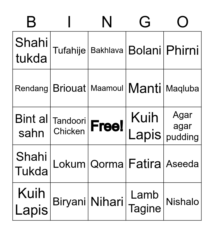 This bingo card has a free space and 33 words: Fatira, Turkish Delight, Tandoori Chicken, Kanafeh, Shahi Tukda, Briouat, Phirni, Kuih Lapis, Tufahije, Sheer Khurma, Maamoul, Bakhlava, Cambaabur, Briouat, Kuih Lapis, Maqluba, Biryani, Bint al sahn, Lokum, Fatira, Qorma, Mansaf, Shahi tukda, Agar agar pudding, Nihari, Nishalo, Bolani, Manti, Rendang, Aseeda, BUKHARI RICE, Lamb Tagine and Bangladeshi Shorshe Ilish.