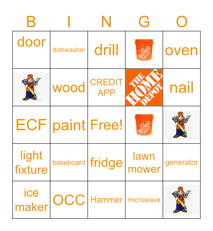 This bingo card has 7 images, a free space and 24 words: Hammer, Light Bulb, paint, sponge, door, drill, wood, lawn mower, microwave, saw, outlet, nail, window, generator, baseboard, light fixture, fridge, oven, ice maker, dishwasher, ECF, OCC, CREDIT APP and ON VOC.