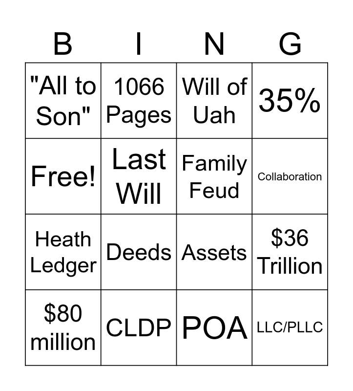 This bingo card has 16 words: CLDP, $36 Trillion, Will of Uah, "All to Son", Heath Ledger, 1066 Pages, Assets, POA, Free!, Last Will, $80 million, 35%, Deeds, Collaboration, Family Feud and LLC/PLLC.