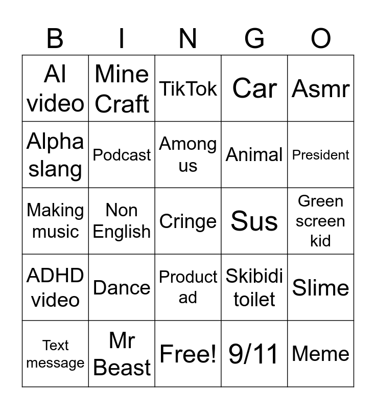 This bingo card has 25 words: ADHD video, Mr Beast, Cringe, 9/11, Asmr, AI video, Mine Craft, TikTok, Sus, Slime, Alpha slang, Podcast, Free!, Skibidi toilet, President, Text message, Non English, Among us, Animal, Green screen kid, Making music, Dance, Product ad, Car and Meme.