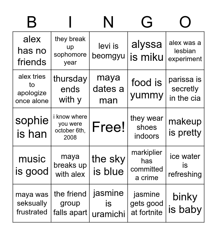 This bingo card has a free space and 24 words: maya breaks up with alex, the friend group falls apart, maya dates a man, maya was seksually frustrated, alex was a lesbian experiment, alex has no friends, alex tries to apologize once alone, they break up sophomore year, they wear shoes indoors, the sky is blue, food is yummy, sophie is han, markiplier has committed a crime, ice water is refreshing, thursday ends with y, jasmine gets good at fortnite, makeup is pretty, levi is beomgyu, parissa is secretly in the cia, i know where you were october 6th, 2008, binky is baby, music is good, alyssa is miku and jasmine is uramichi.