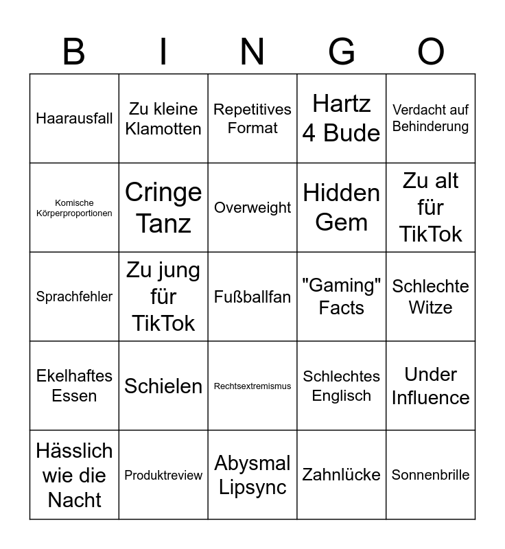 This bingo card has 25 words: Schielen, Abysmal Lipsync, Overweight, Hässlich wie die Nacht, Verdacht auf Behinderung, Haarausfall, Komische Körperproportionen, Zu kleine Klamotten, "Gaming" Facts, Rechtsextremismus, Hidden Gem, Sprachfehler, Schlechtes Englisch, Under Influence, Cringe Tanz, Sonnenbrille, Schlechte Witze, Repetitives Format, Zu alt für TikTok, Zu jung für TikTok, Fußballfan, Produktreview, Ekelhaftes Essen, Hartz 4 Bude and Zahnlücke.