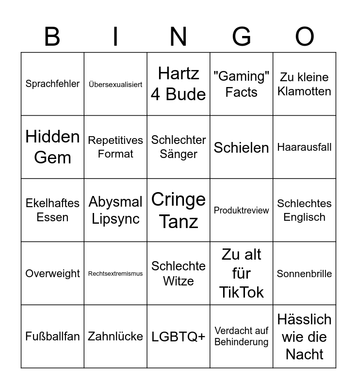 This bingo card has 25 words: Rechtsextremismus, LGBTQ+, Schlechter Sänger, Fußballfan, Zu kleine Klamotten, Sprachfehler, Hidden Gem, Übersexualisiert, Produktreview, Schlechte Witze, Schielen, Ekelhaftes Essen, Zu alt für TikTok, Sonnenbrille, Repetitives Format, Hässlich wie die Nacht, Schlechtes Englisch, Hartz 4 Bude, Haarausfall, Abysmal Lipsync, Cringe Tanz, Zahnlücke, Overweight, "Gaming" Facts and Verdacht auf Behinderung.