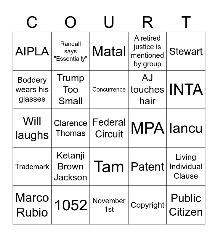 This bingo card has 36 words: The word "clearly" is used, FIRE, Lanham Act, Trump Too Small, Patent, Trademark, Concurrence, Taylor, Stewart, writ of certiorari, Clarence Thomas, A retired justice is mentioned by group, Commerce, MPA, INTA, AIPLA, Public Citizen, Ketanji Brown Jackson, Federal Circuit, Matal, Iancu, Living Individual Clause, 1052, Marco Rubio, November 1st, Randall says "Essentially", Will laughs, Elazjia wears glasses, AJ touches hair, Boddery wears his glasses, Boddery does not put on his glasses at all, Political Speech, Copyright, Tam, Brunetti and C-Span.