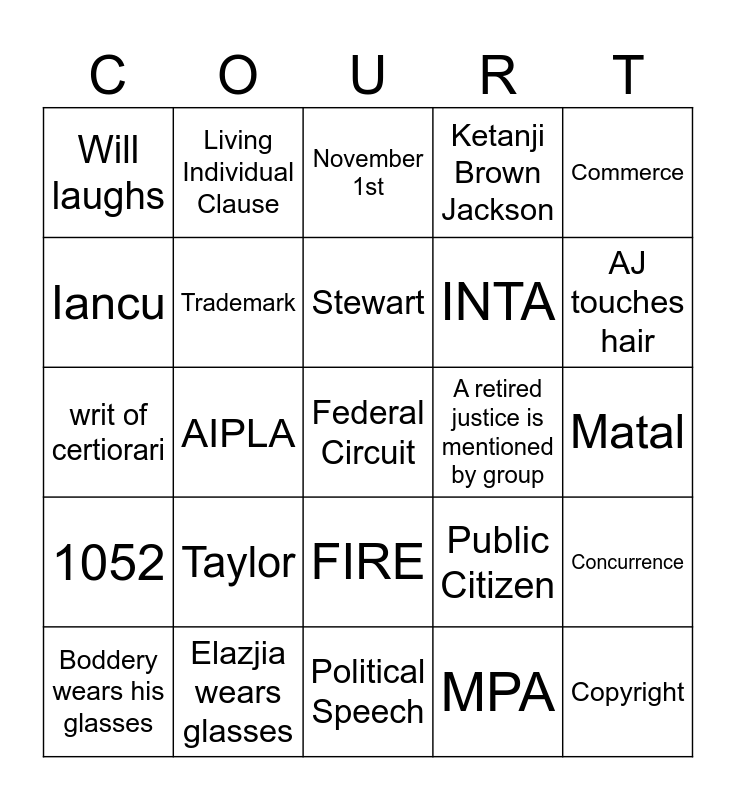 This bingo card has 38 words: Lanham Act, Trump Too Small, Patent, Trademark, Concurrence, Taylor, Stewart, Clarence Thomas, Commerce, INTA, AIPLA, Ketanji Brown Jackson, Federal Circuit, Matal, Iancu, 1052, Marco Rubio, November 1st, Randall says "Essentially", A retired justice is mentioned by group, Will laughs, Elazjia wears glasses, AJ touches hair, Boddery wears his glasses, Boddery does not put on his glasses at all, Political Speech, Copyright, Tam, Brunetti, C-Span, The word "clearly" is used, FIRE, MPA, Living Individual Clause, Justice Brennan is on the slides, Public Citizen, writ of certiorari and Randall printed out too many sheets.
