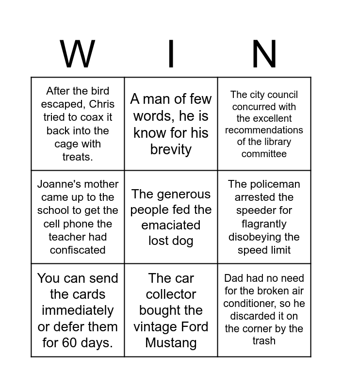 This bingo card has a free space and 8 words: The policeman arrested the speeder for flagrantly disobeying the speed limit, The city council concurred with the excellent recommendations of the library committee, A man of few words, he is know for his brevity, You can send the cards immediately or defer them for 60 days., After the bird escaped, Chris tried to coax it back into the cage with treats., Dad had no need for the broken air conditioner, so he discarded it on the corner by the trash, Joanne's mother came up to the school to get the cell phone the teacher had confiscated and The car collector bought the vintage Ford Mustang.